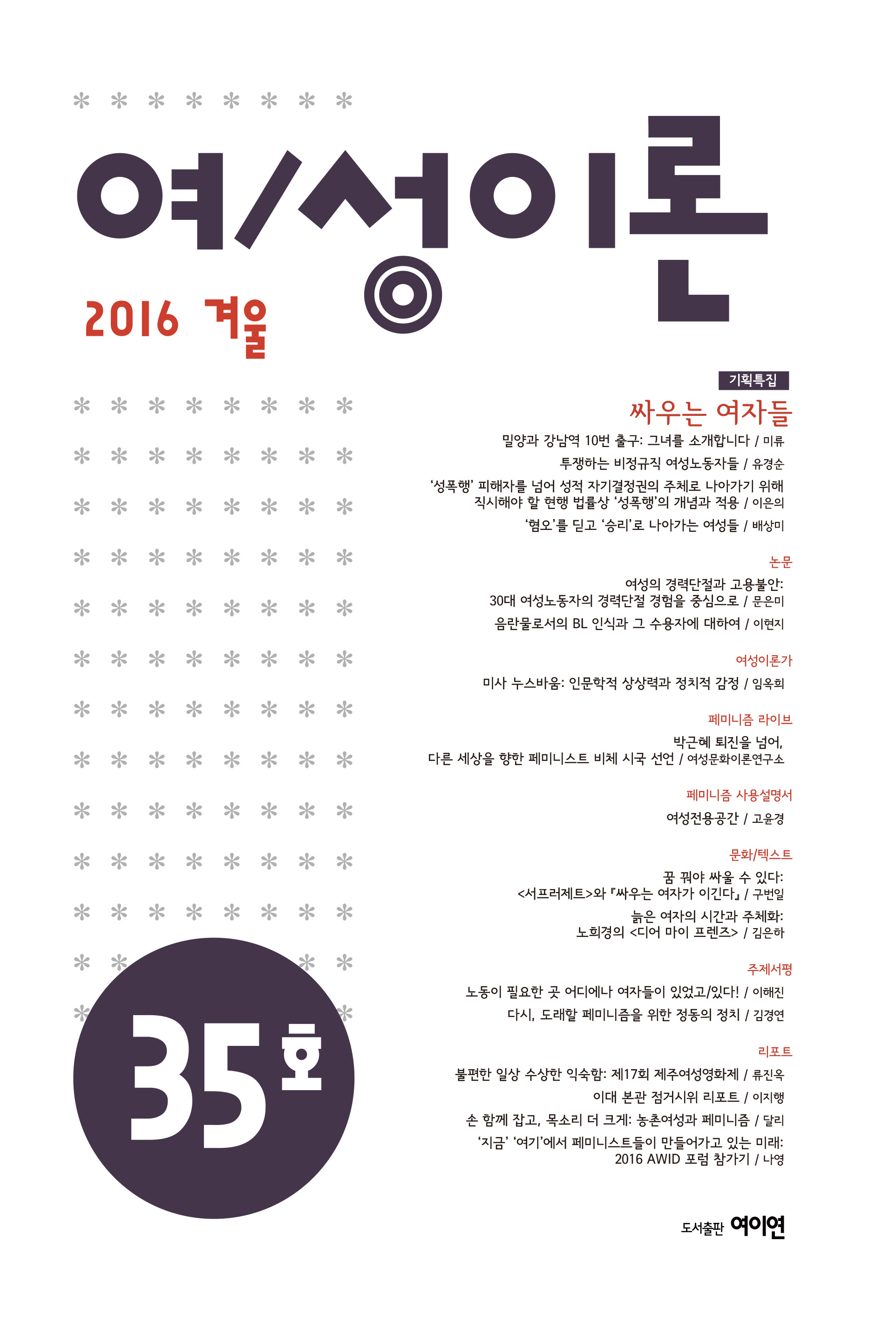 이번 35호 기획특집의 제목은 “싸우는 여자들”이다. 이번 특집에서는 한국에 존재하는 다양한 페미니즘 운동들의 의의와 성과를 되짚어 보면서 치열했던 그 역사를 소환하고, 지금 이 순간 펼쳐지고 있는 페미니즘 운동의 한계를 넘어 페미니즘의 지평을 확장할 수 있는 길을 모색해보고자 하였다. 기획회의를 하면서 편집위원들이 주목한 것이 ‘계보’와 ‘연대’였는데 광장에 나가면 이 말은 더욱 절실히 다가온다. 계보와 연대는 두 가지 지점에서 나오게 된 말들이다. 여기에는 강남 화장실 살인사건 이후, 터진 둑의 물처럼 쏟아져 나온 목소리들이 이전에 이미 시작된 목소리들과 만날 수 있기를 바라는 마음이 있다. 동시에 그 목소리들이 외롭지 않기를, 도처에 ‘우리’가 있음을 알기를, 그리하여 도처에서 우리가 ‘함께’ 하고 있음을 알기를, 그러니 결코 힘 잃지 말기를 바라는 마음이 있다. 단순하고 소박한 바람에서 시작된 기획이지만 서로에게 참조가 되어줄 만한 아주 소중하고 훌륭한 글들이 모였다. 순서대로 읽어도 좋고 지그재그로 교차읽기를 해도 흥미로울 것이다.