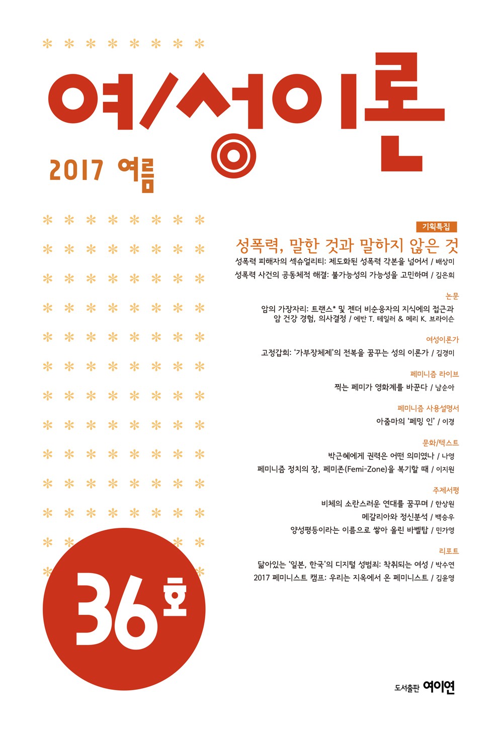 성폭력, 말한 것과 말하지 않은 것 ▪ 주요내용 2017년 5월, 『여/성이론』 기획특집 주제는 ‘성폭력’이다. 한국 사회에 만연해 있는 성폭력 범죄에 경종을 울리기 위해 여성들이 이를 심각한 사회문제로 제기하기 시작한 지도 오랜 시간이 흘렀다. 그럼에도 불구하고 무려 ‘여성’ 대통령이 재임 중이었던 국가 행정의 최고기관에서부터 정당, 사회운동계, 영화계, 문학계 등 곳곳에서 기시감을 불러일으키는 성폭력 사안들이 그야말로 터져 나오고 있다. 대체 무엇이 어떻게 잘못된 것인가? 성폭력을 뿌리 뽑고자 해왔던 그동안의 싸움이 어딘가 잘못되었던 걸까? 이번 36호에서는 이 질문들에 답해보고자 하였다.