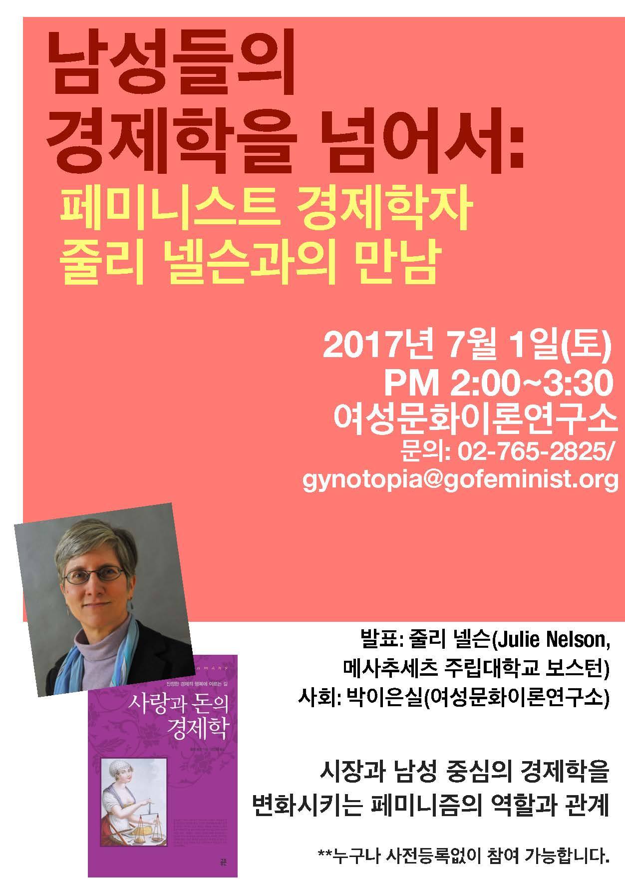 메사추세츠 주립대학교(보스톤) 교수이며 <사랑과 돈의 경제학>(공존, 2007), <남성들의 경제학을 넘어서>(한국외국어대학교출판부, 1997)의 저자인 줄리 넬슨 교수를 모시고 시장과 남성 중심의 경제학을 변화시키는 힘으로써 페미니즘의 역할과 관계 등에 대해 들어보는 시간을 갖고자 합니다.