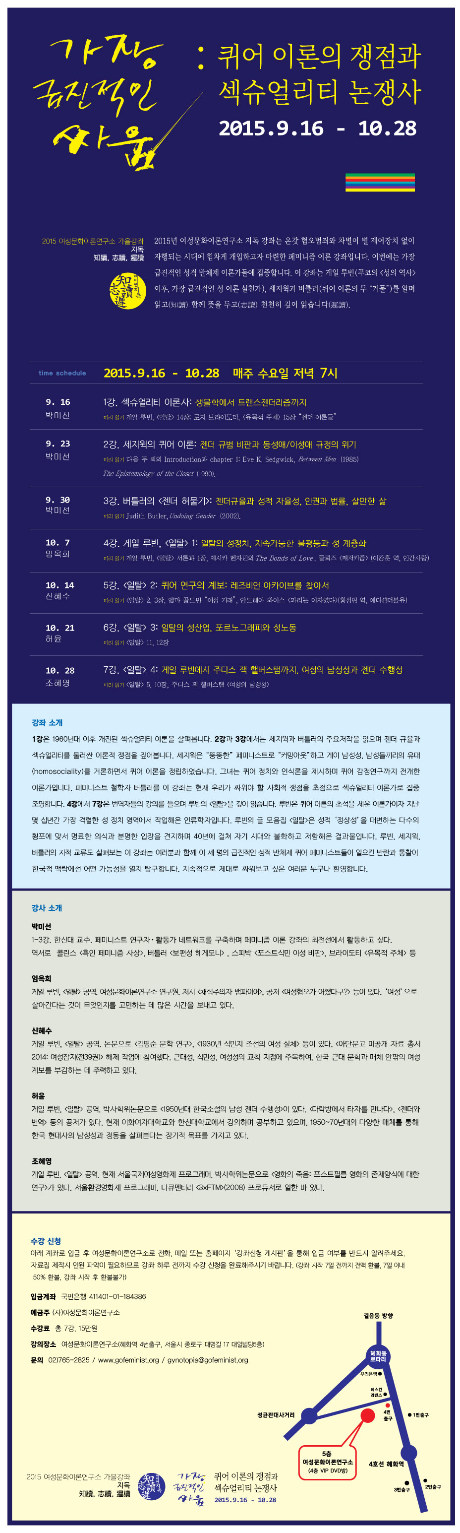 2015년 여성문화이론연구소 지독강좌는 온갖 혐오범죄와 차별이 별 제어장치 없이 자행되는 시대에 힘차게 개입하고자 마련한 페미니즘 이론 강좌입니다. 이번에는 가장 급진적인 성적 반체제 이론가들에 집중합니다. 이 강좌는 게일 루빈(푸코의 <성의 역사> 이후, 가장 급진적인 성 이론 실천가), 세제윅과 버틀러(퀴어 이론의 두 “거물”)를 알며 읽고(知讀), 함께 뜻을 두고(志讀) 천천히 깊이 읽습니다(遲讀).