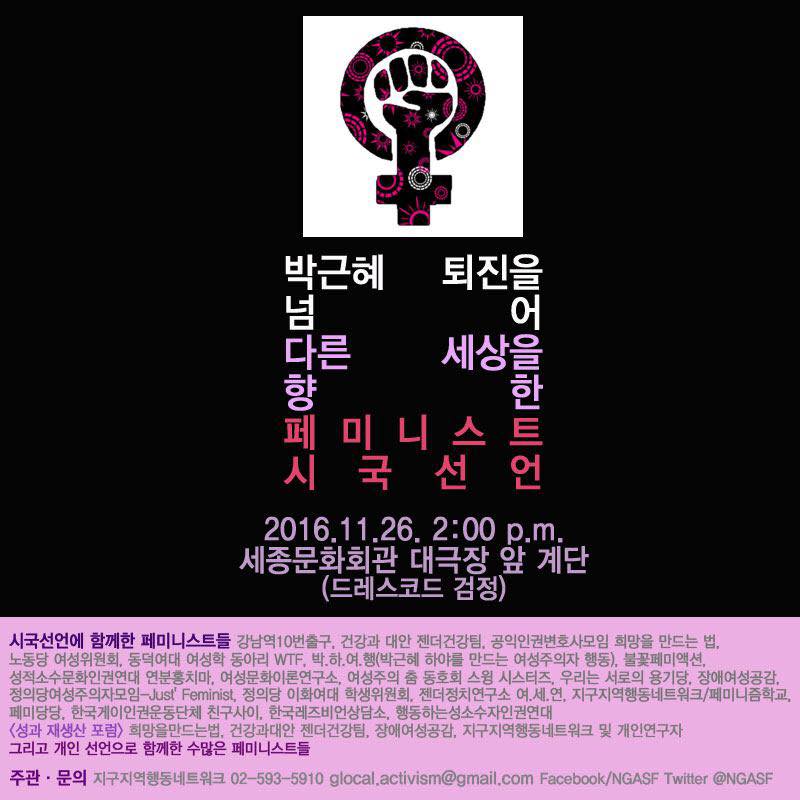 우리는 페미니즘에 무지한 박근혜 정권의 퇴진을 요구한다. 그러나 이와 더불어 비판세력이 여성혐오라는 감정의 정치를 더 이상 동원하지 말 것도 요구한다. 우리는 집회에서의 여성비하 발언을 더 이상 보고 있지 않을 것이며, 성추행을 더 이상 용인하지 않을 것이다.