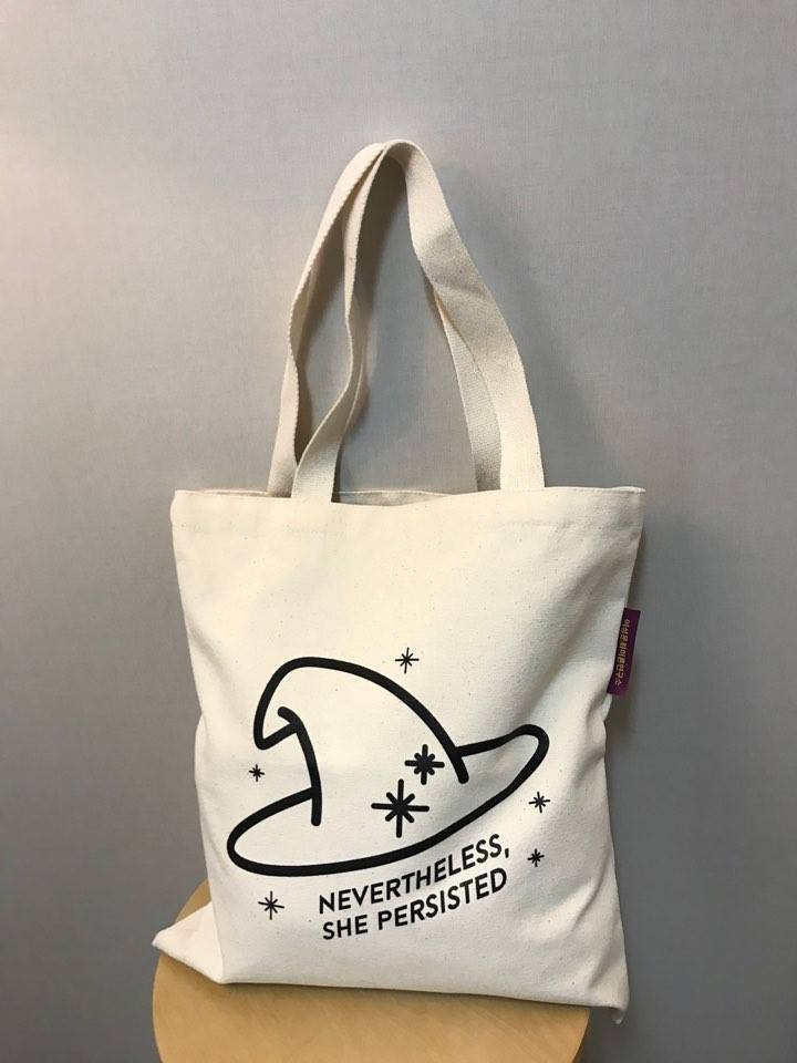 마녀의 모티프가 담긴 에코백에는 살아남은 배운 여자, 마녀의 지속적인 탐구와 지적여정을 위해 “Nevertheless, She Persisted”(그럼에도 불구하고, 그녀는 살아남았다)라는 문구를 함께 적었습니다.