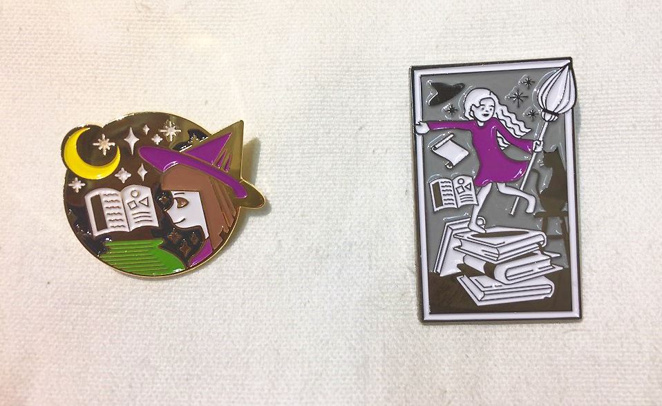 왼쪽에 보이는 금도금 뱃지A는 달빛 아래에서 주문을 빌며 끓는 솥에서 묘약을 만들 듯, 중얼중얼 거리며 책을 연성해내는 마녀, 여성연구자를 상징합니다.