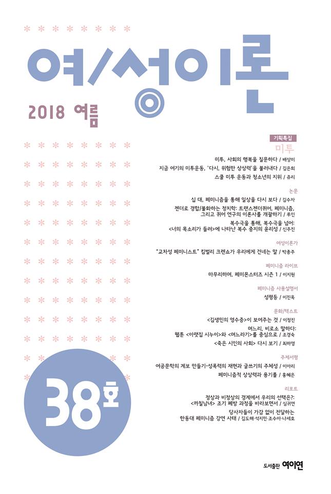 여/성이론 38호는 현재 한국 사회에서 갈등의 최전선에 놓여있는 페미니즘의 현 상황을 점검하였다. 미투 운동, 페미니즘 내 ‘트랜스’의 위치에 대한 문제, 인터넷을 중심으로 활동하는 페미니스트 그룹, 이성애 중심주의를 공고히 하려는 정부, 기관, 대학 등 페미니즘을 둘러싸고 다양한 공간에서 여러 방식으로 발생하는 충돌들을 살폈다.