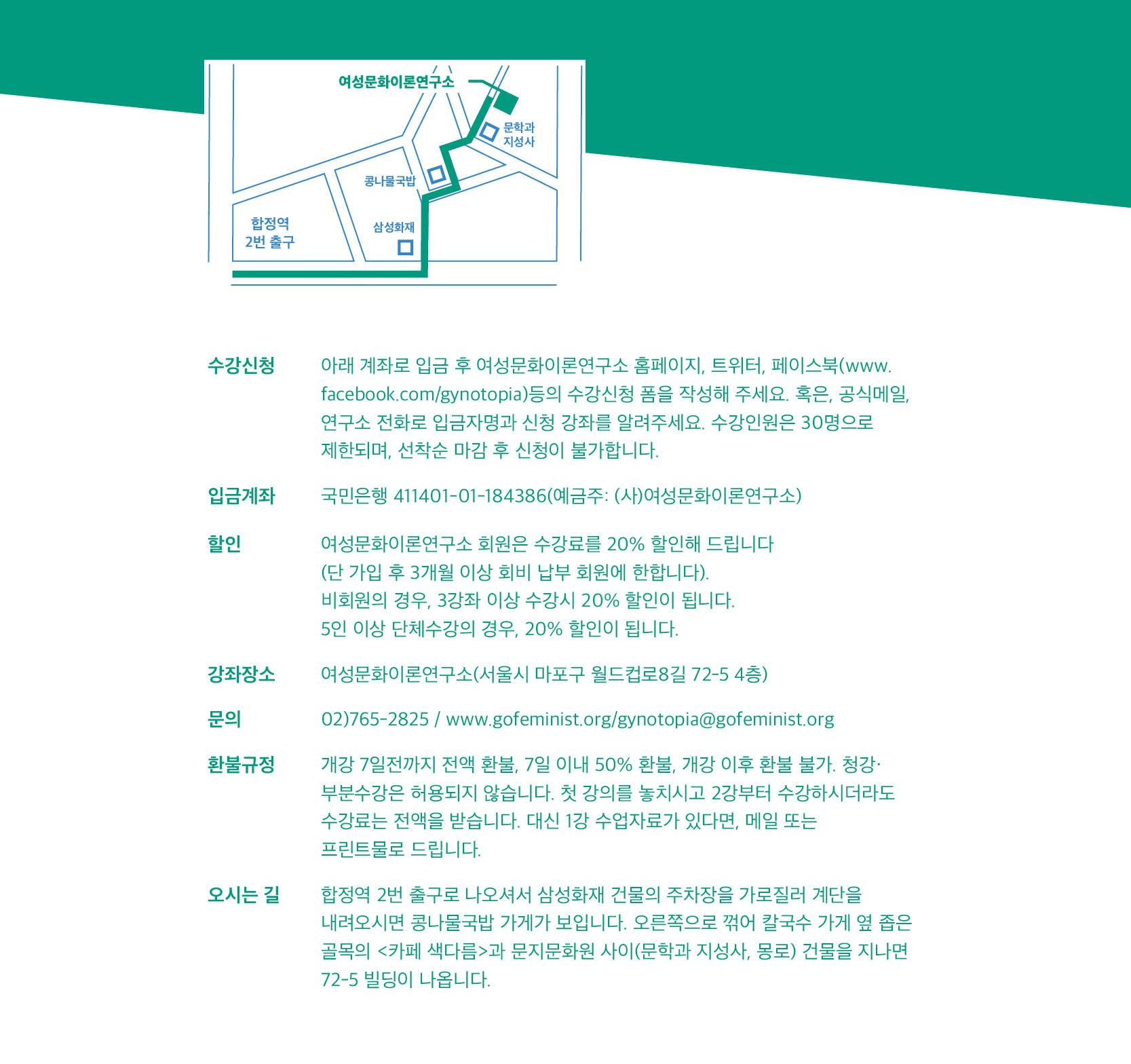 ● 강좌장소: 여성문화이론연구소(서울시 마포구 월드컵로8길 72-5 4층)
