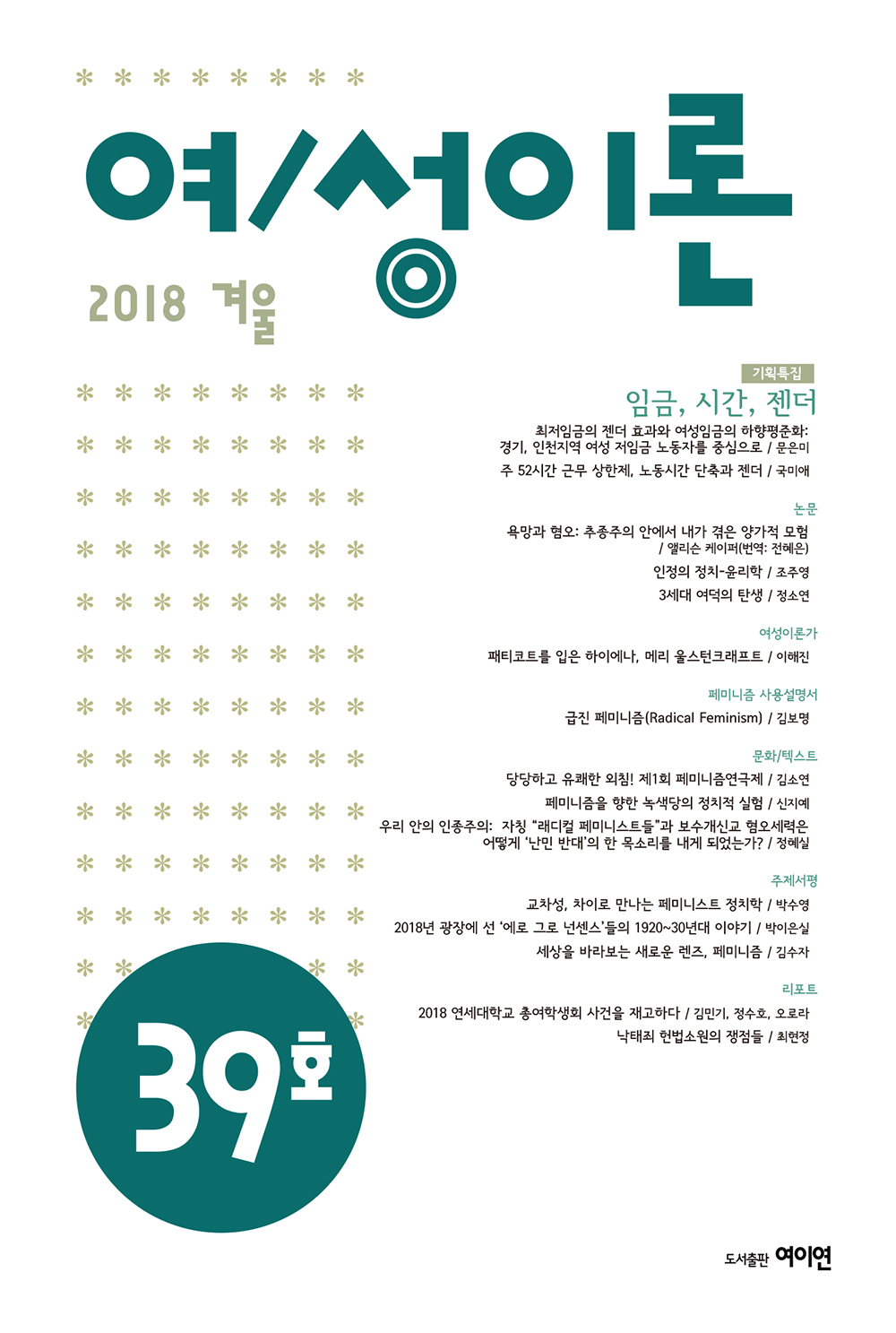 여/성이론 39호는 페미니즘의 시각에서 최근 한국사회의 변화를 분석하고자 했다. 한국 정부의 노동정책, 팬덤 문화의 변화, 미투 이후 공동체의 변화, 정치운동 지형의 변화, 난민 유입, 젠더문제에 대한 10대들의 관심 증가, 총여학생회 존폐논의, 낙태죄 헌법소원 등과 같이 현재 한국사회에서 일어나는 변화들을 페미니즘의 시각에서 바라본다면 어떤 의의들과 어떤 한계들을 논의할 수 있는지 살폈다.