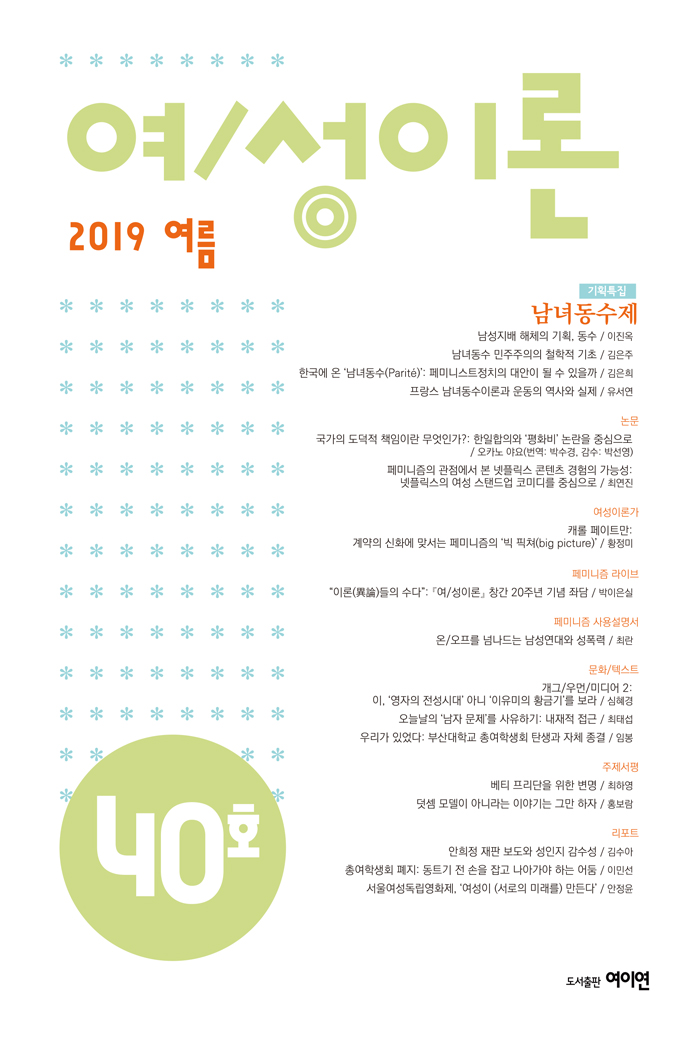 여/성이론 40호는 페미니즘과 조우하면서 변화하고 있는 현재 한국 사회의 양상을 문화적·정치적 측면에서 살펴보았다. 이번 기획특집인 ‘남녀동수제’는 한국사회에서 부상한 페미니즘 운동의 성장을 정치권에서 ‘남녀동수제’라는 방식으로 선취할 수 있을지, 선취한다면 그 한계는 무엇인지 살펴보았다. 이진옥은 「남성지배 해체의 기획, 동수」에서 프랑스를 중심으로 한 해외의 ‘남녀동수제’ 논의와 현황을 참고하면서, ‘남녀동수제’가 비장애인 남성 중심으로 구성되어있는 현재 한국 정치계를 변화시킬 수 있는 중요한 동인이 될 수 있음을 역설하였다. 김은주의 「남녀동수 민주주의의 철학적 기초」는 유럽과 프랑스를 중심으로 ‘남녀동수제’ 담론의 철학적 기초와 이 제도가 실제로 시행된 이후의 결과를 살피면서, 이 제도가 여성대표성의 성장에 기여한다는 점을 논하였다. 반면, 김은희는 「한국에 온 ‘남녀동수(parité)’: 페미니스트 정치의 대안이 될 수 있을까」에서 한국에서의 ‘남녀동수제’ 논의를 검토하면서 현재의 ‘남녀동수제’ 논의가 이성애주의를 강화할 가능성을 우려하며 상호인정을 바탕으로 하는 페미니스트 정치의 필요성을 역설한다. 마지막으로 유서연의 「프랑스 남녀동수이론과 운동의 역사와 실제」는 프랑스의 ‘남녀동수제’ 논의가 놓여있는 프랑스 페미니즘의 독자적인 맥락과 이론적 지형을 소개하여 한국에서 이 논의를 수용할 때 유의할 점을 짚어주었다.