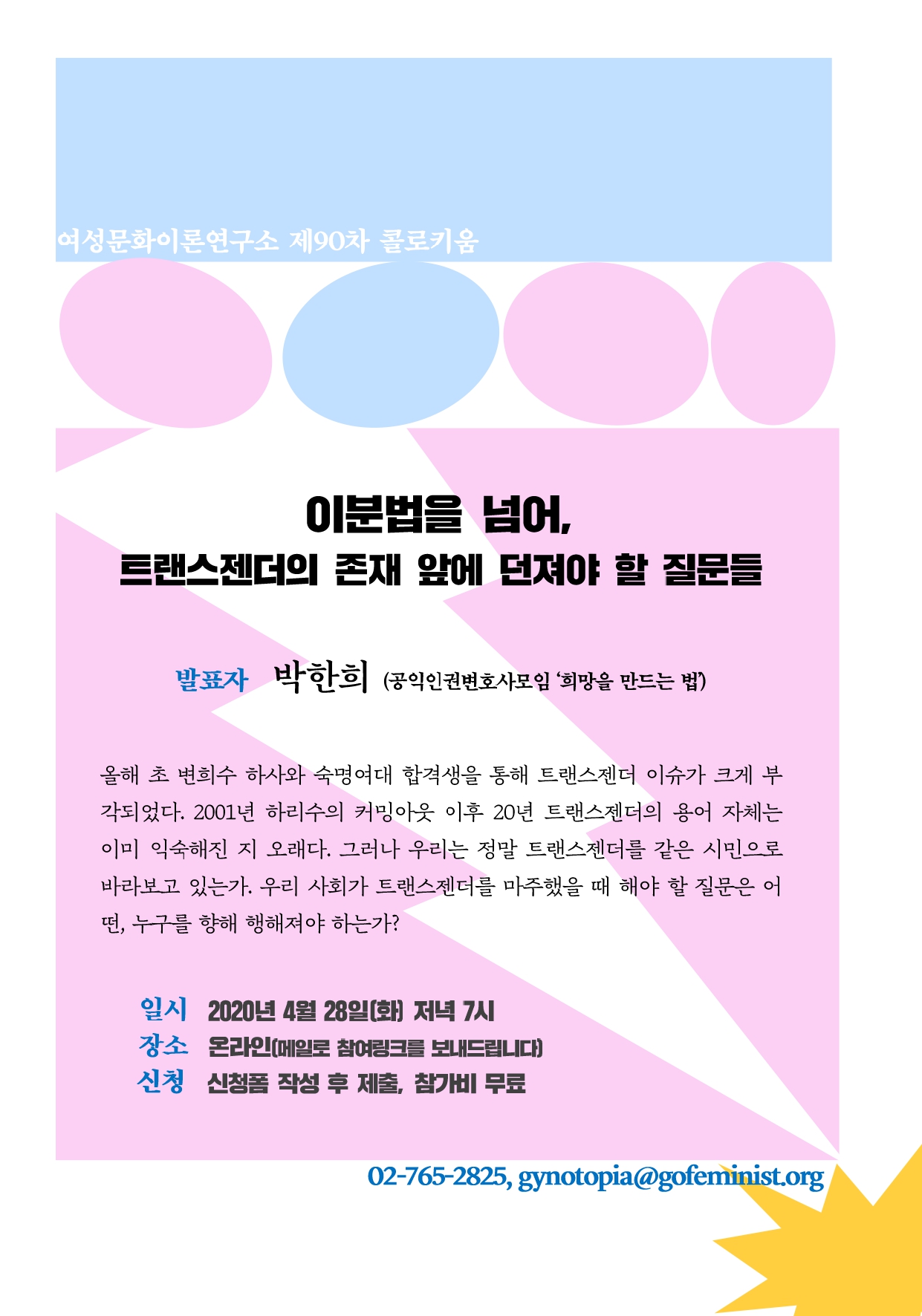 | [제91차 콜로키움] 방법으로서의 BL: 생물학적 본질주의를 탈자연화하기 (1) | 2022.04.20 |
