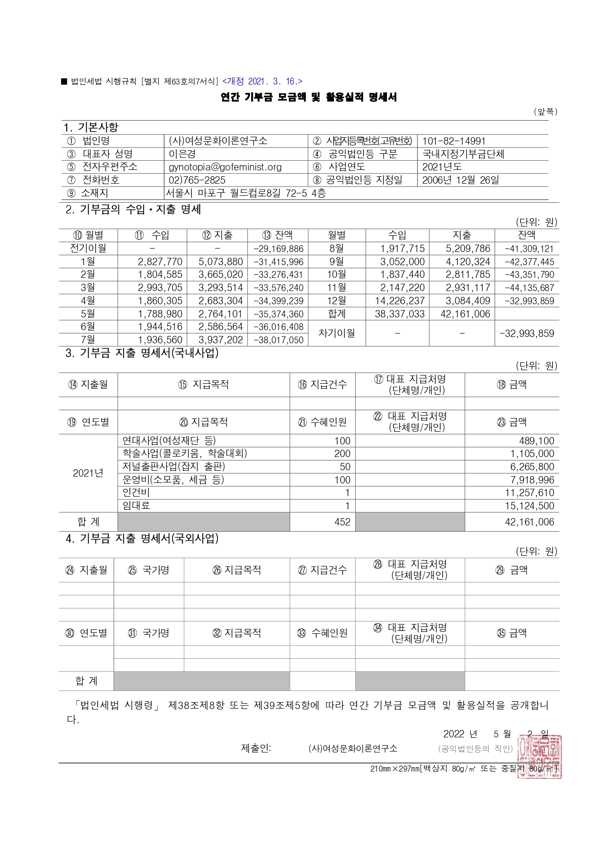 사단법인 여성문화이론연구소는 지정기부금단체로, 「법인세법 시행령」에 따라 2021년 연간 기부금 모금액 및 활용실적을 아래와 같이 공개합니다.