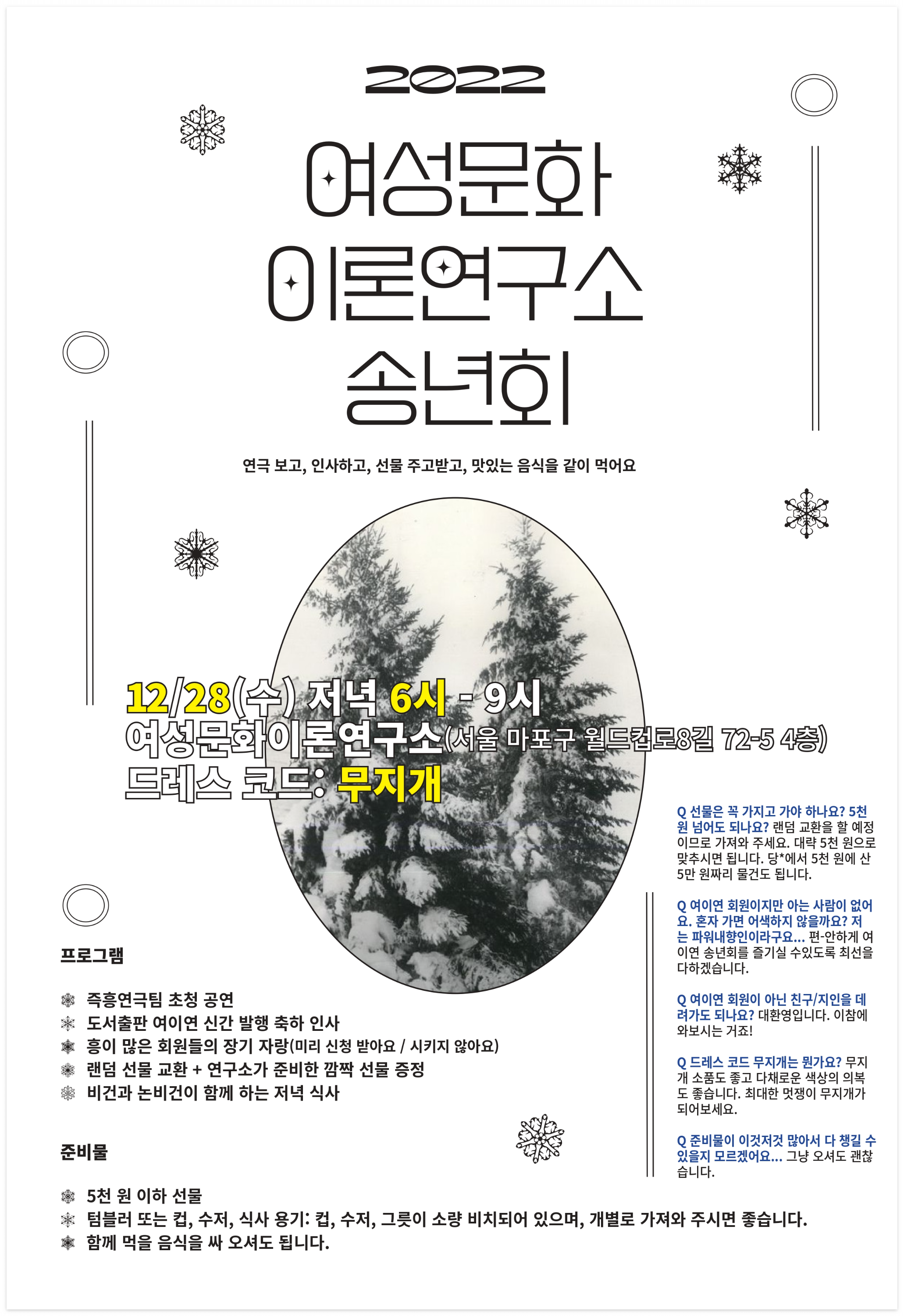 Q 여이연 회원이지만 아는 사람이 없어요. 혼자 가면 어색하지 않을까요? 저는 파워내향인이라구요... → 편-안하게 여이연 송년회를 즐기실 수있도록 최선을 다하겠습니다.