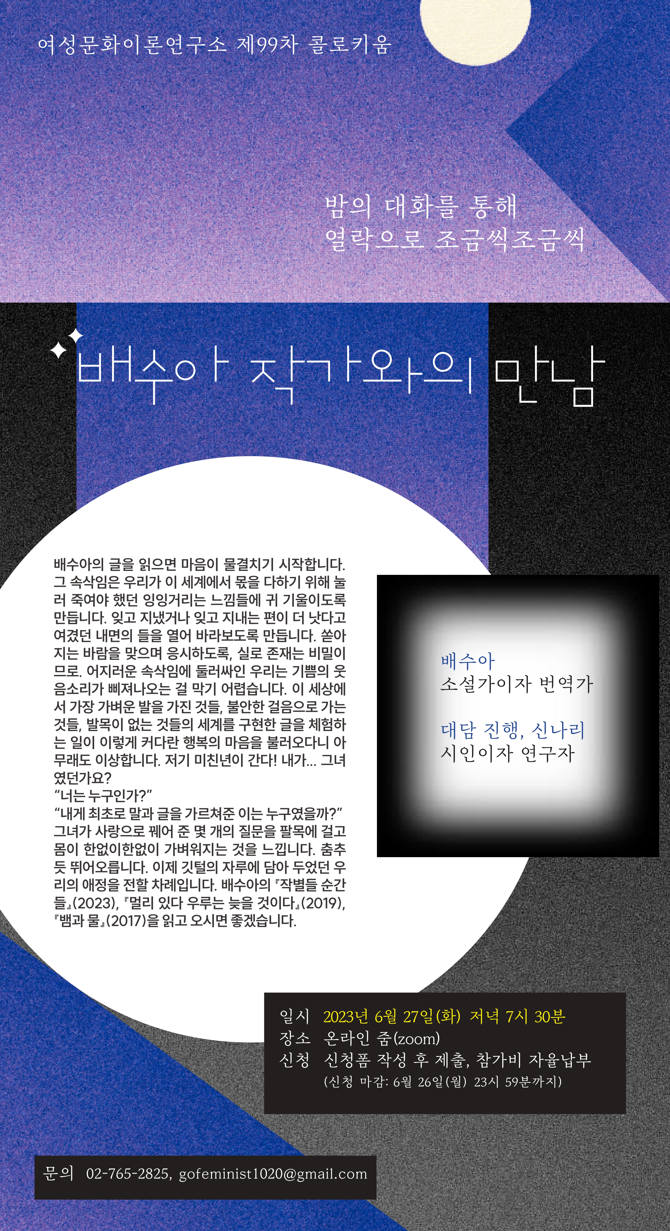 ● 신청: 신청폼 작성 후 제출(~6/26까지), 참가비 자율납부(국민 411401-01-184386 예금주: 사단법인여성문화이론연구소)