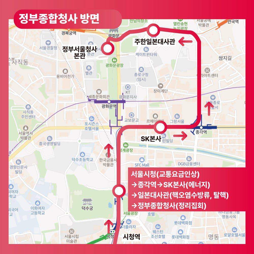 세종대로 → 서울시청 → SK본사 → 일본대사관 → 서울정부청사 앞(도착)
