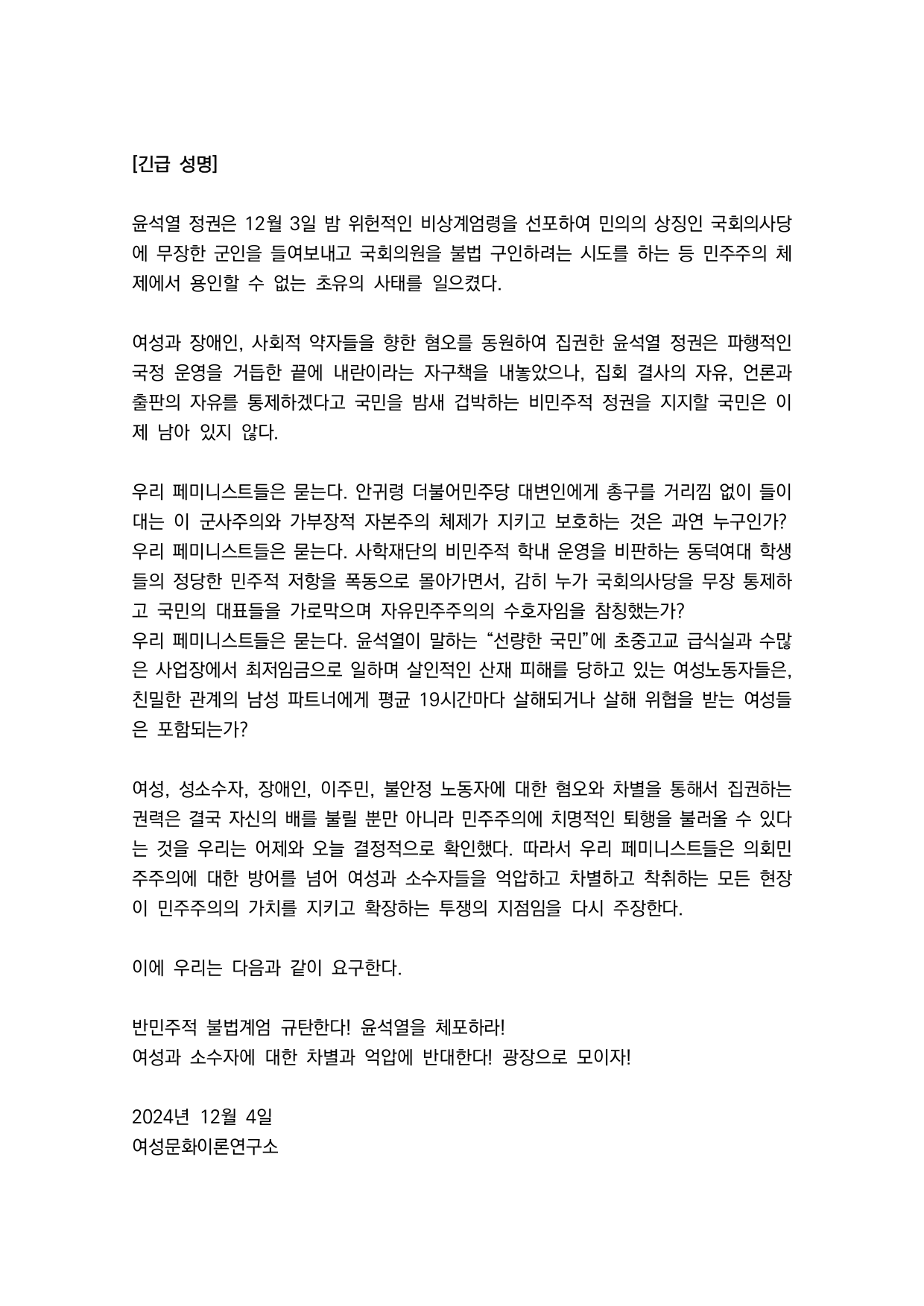 여성과 장애인, 사회적 약자들을 향한 혐오를 동원하여 집권한 윤석열 정권은 파행적인 국정 운영을 거듭한 끝에 내란이라는 자구책을 내놓았으나, 집회 결사의 자유, 언론과 출판의 자유를 통제하겠다고 국민을 밤새 겁박하는 비민주적 정권을 지지할 국민은 이제 남아 있지 않다.