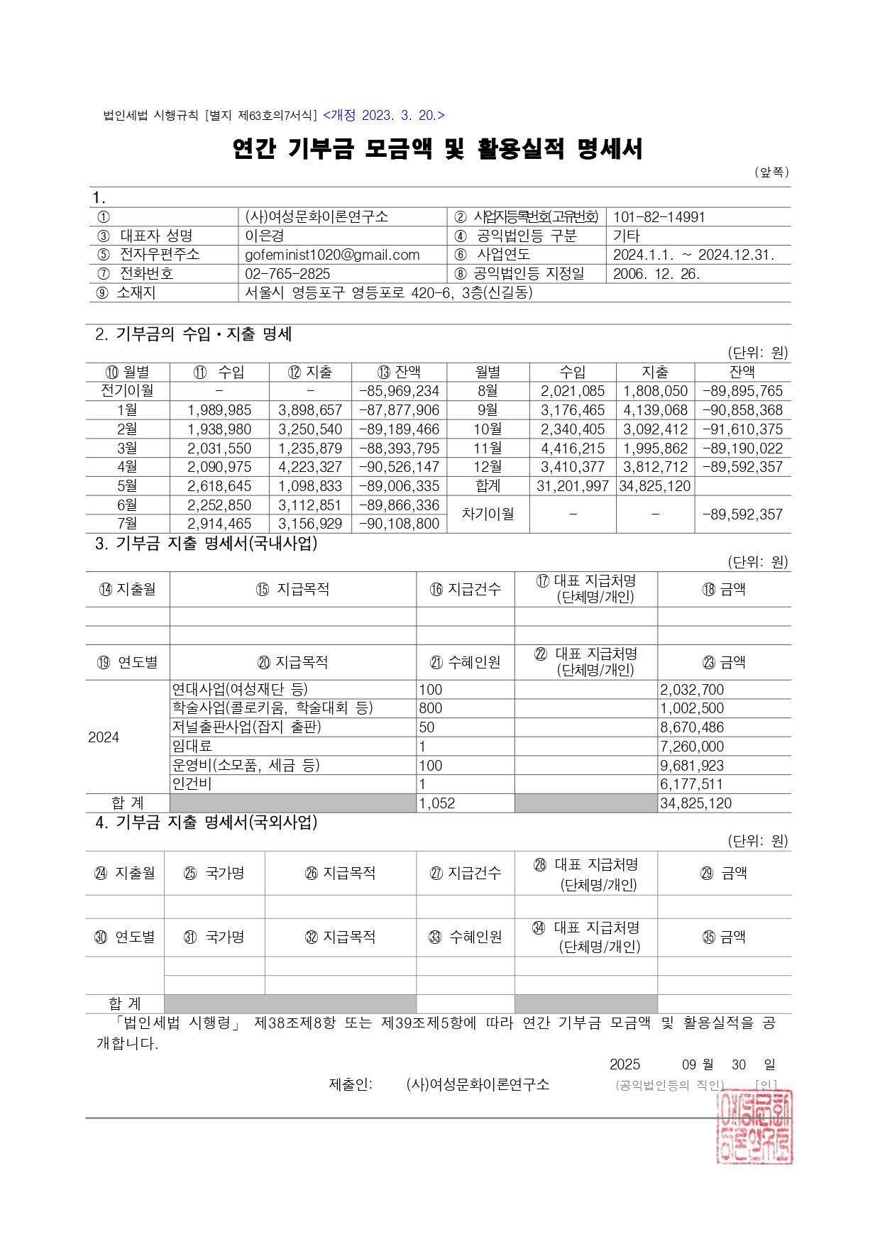 사단법인 여성문화이론연구소는 지정기부금단체로, 「법인세법 시행령」에 따라 2024년 연간 기부금 모금액 및 활용실적을 아래와 같이 공개합니다.
