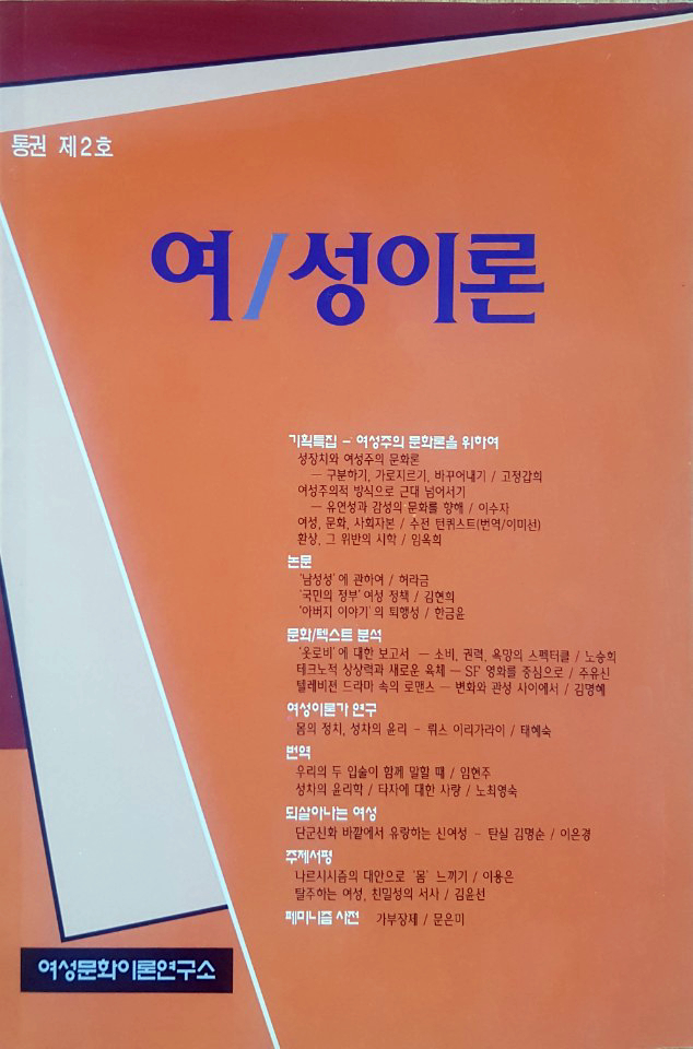 | 기획특집 - 여성주의 문화론을 위하여 성장치와 여성주의 문화론 - 구분하기, 가로지르기, 바꾸어내기/고정갑희 여성주의적 방식으로 근대 넘어서기 - 유연성과 감성의 문화를 향해/이수자 여성, 문화, 사회자본/수전 턴퀴스트(번역/이미선) 환상, 그 위반의 시학/임옥희 논문 ‘남성성’에 관하여/허라금 ‘국민의 정부’ 여성정책/김현희 ‘아버지 이야기’의 퇴행성/한금윤 문화/텍스트 분석 '옷로비'에 대한 보고서 - 소비, 권력, 욕망의 스펙터클/노승희 테크노적 상상력과 새로운 육체 - SF 영화를 중심으로/주유신 텔레비젼 드라마 속의 로맨스 - 변화와 관성 사이에서/김명혜 여성이론가 연구 몸의 정치, 성차의 윤리 - 뤼스 이리가라이/태혜숙 번역 우리의 두 입술이 함께 말할 때/임현주 성차의 윤리학 - 타자에 대한 사랑/노영숙 되살아나는 여성 단군신화 바깥에서 유랑하는 여성 - 탄실 김명순/이은경 주제서평 나르시시즘의 대안으로 ‘몸' 느끼기/이용은 탈주하는 여성, 친밀성의 서사/김윤선 페미니즘 사전 가부장제/문은미 |