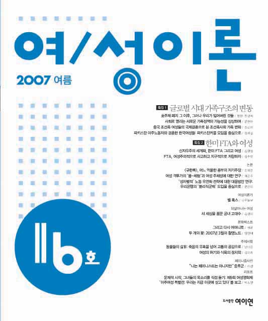 | 머리말 이산의 시대 가족구조의 변동에 부쳐 / 임옥희 특집 1: 글로벌 시대 가족구조의 변동 호주제 폐지 그 이후, 그러나 우리가 잃어버린 것들 / 행인·한상희 사회로 열리는 새로운 가족정책의 가능성을 상상하며 / 문현아 중국 조선족 여성들의 국제결혼으로 본 조선족사회 가족 변화 / 전신자 파키스탄 이주노동자와 결혼한 한국여성들: 파키스탄커플 모임을 중심으로 / 정혜실 특집 2: 한미FTA와 여성 신자유주의 세계화, 한미FTA 그리고 여성 / 김원정 FTA, 여성주의적으로 사고하고 지구적으로 저항하자 / 정주연 논문 <규한록>, 어느 억울한 종부의 자기주장 / 조혜란 여성 격투가의 ‘몸-체험’과 여성 주체성에 대한 연구 / 허은주 ‘성차별적’ 노동 유연화 전략에 대한 대응방안 연구: 우리은행의 ‘직군분리제’ 도입을 중심으로 / 문은미 여성이론가 벨 훅스 / 나무늘보 되살아나는 여성 새 세상을 꿈꾼 궁녀 고대수 / 김경미 문화텍스트 그리고 다시 어머니로 / 허윤 두 개의 꽃: 2007년 3월의 촬영노트 / 임인애 주제서평 동물들의 삶Ⅲ: 죽음의 유혹을 넘어 고통의 공감으로 / 남다은 여성의 허기와 식욕의 정치학 / 성미라 페미니즘사전 “나는 페미니스트는 아니지만” 증후군 / 이경 리포트 문제적 시작,그녀들의 목소리를 직접 듣기: 제9회 여성영화제‘이주여성 특별전: 우리는 지금 이곳에 살고 있다’를 보고/ 박소영 |