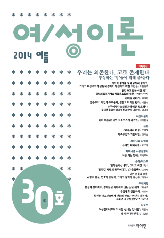 의도한 바는 아니었지만, 『여/성이론』 30호의 기획특집, ‘우리는 의존한다, 고로 존재한다: 부상하는 ‘망’들에 대해 묻/듣다’는 세월호의 충격으로부터 대안적 삶을 모의하는 가이드라인이 될 수도 있겠다. 기획특집에서 후기 자본주의의 공허한 삶을 꿰뚫을 가능성으로 페미니즘과 사회적 경제를 가늠해 본다. 오김현주는 총론으로 사회적 경제, 공동체 경제, 페미니즘 경제의 형성 조건을 제시하였고, 이후의 필자들은 각자 자신들이 헌신하고 있는 지역과 영역의 성과를 보고했다. 추혜인은 의료, 김정희는 농업, 박종숙은 주택, 정경섭은 동물병원의 활동을 알렸다. 또한 리포트 란에 실린 이명원의 글은 지식순환협동조합을 소개하고 있어 기획특집과 함께 읽으면 좋을 것이다. 독자들도 이들 공동체 중 절실한 무엇인가에 손을 내밀고, 어쩌면 새로운 영역에서 사회적 경제를 시작하는 용기도 얻게 되기를 기대해 본다.