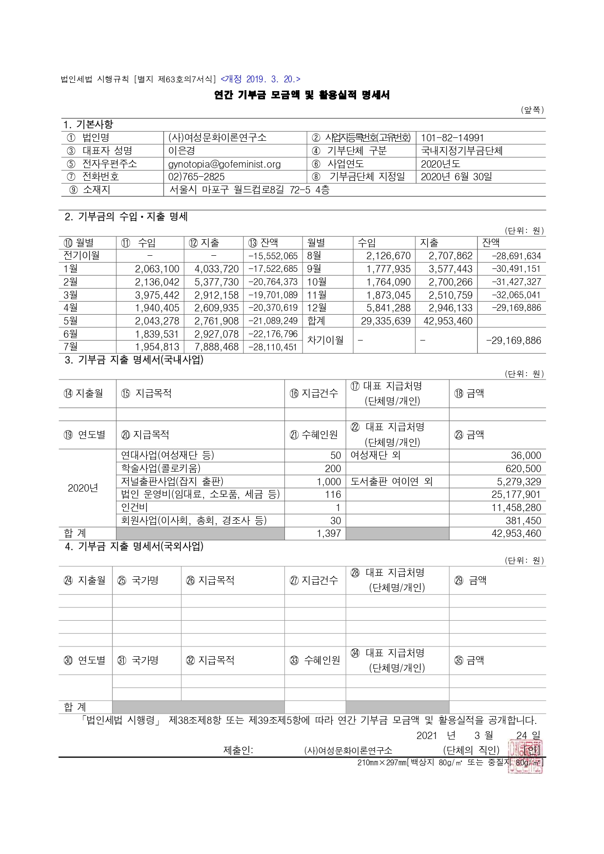 사단법인 여성문화이론연구소는 지정기부금단체로, 「법인세법 시행령」에 따라 2020년 연간 기부금 모금액 및 활용실적을 아래와 같이 공개합니다.